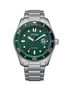 Read MoreSport meets luxury with the new Citizen Eco-Drive. Versatile and easy to wear for any occasion, this timepiece features a stainless-steel case,emerald green dial, luminous hands and stainless-steel bracelet. Additional features include mineral crystal, fold-over double-push closure and water resistance of 100 meters.