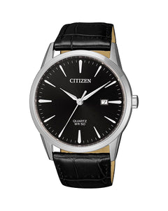 Read MoreWhen it comes to this Quartz powered watch from the Gents Dress Collection, sophistication lies in simplicity and reliability. Delivering a sharp look and the durability required for everyday wear, it is crafted from mineral glass and black dial with silver toned stainless steel case, stylishly paired with a gorgeous black leather strap featuring date display for a look that suits any wardrobe. Equipped with 3 year battery life, WR50/5bar and handy push button buckle, it is a timepiece you can depend on.