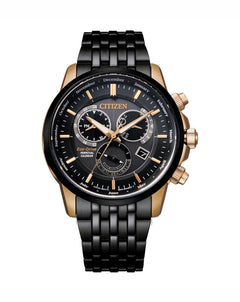 Read MoreDesigned to make a statement. This perpetual calendar boasts dual time and 1. 5 years power reserve. Featuring an ultra smooth black dial with hints of gold, sapphire glass and push button buckle. Never be late with day/date, alarm and month chronograph. Also featuring Eco drive technology, powered by light, any light. Never needs a battery.