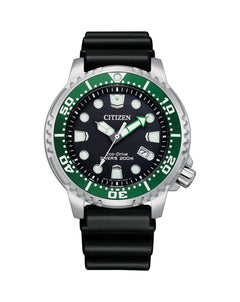 Proof that a dive watch can be fun and functional with Citizen ISO compliant 200m Promaster Marine. With Eco-Drive technology, it is powered by light and never needs a battery. Featuring a one way rotating elapsed time bezel and screw down crown. It is stylishly understated with its dazzling emerald green bezel and rich black dial. It will let you reach your limits and provide your life with the adventure you are searching for.