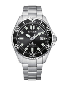 Read MoreThe latest Promaster Dive timepiece blends rugged functionality with standout design. Crafted in silver-tone stainless steel and sized at a comfortable 41mm, it features a matching triple-link bracelet and a bold black unidirectional bezel for a sporty edge. The gradient black dial is designed for maximum visibility, with luminous applied hour markers and a distinctive handset that ensures clarity in all lighting conditions. A discreet date window at 3 o’clock adds everyday practicality. Powered by Citizen’s Eco-Drive technology—fueled by light, never needs a battery. This ISO-compliant diver is water resistant to 200 metres, and includes an exclusive dive tank box. Calibre E168.
