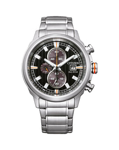 A sporty and masculine appeal, this timepiece will be sure to turn heads. Featuring a sleek black dial with orange accents, chronograph and date. Crafted with a stainless steel band and side capped crown. Powered by Eco-Drive technology, never needing a battery.