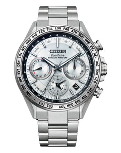 Read MoreRenowned for its innovative design and advanced technology, Attesa continues to set the standard in the evolution of reliable luxury timepieces. The F950 series, powered by cutting-edge Eco-Drive Satellite Wave GPS technology, distinguishes itself with the world's fastest time-only signal reception—achieved in just three seconds. Housed in a scratch-resistant silver Duratect Super Titanium™ case with a matching bracelet, this watch offers exceptional durability and everyday practicality. Key features include a sapphire crystal bezel, 39-city world time, a sophisticated silver three-register chronograph dial with silver-tone accents, dual time functionality, a perpetual calendar, light level indicator, charge suspension temperature detection, overcharge prevention, overdischarge detection, and water resistance up to 100 meters.