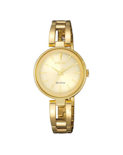 Read MoreSophisticated yet classic designed watch was created to maintain a refined look. Featuring a sleek gold tone stainless steel caseand bracelet with a champagne dial. Our Eco-Drive technology gives this watch the ability to use light as a power source, taking away the expense and inconvenience of replacement batteries. Caliber number E031.