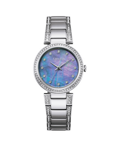 Read MoreTurn heads with this sophisticated timepiece for your collection. Delicately featuring crystals crafted on the bracelet. Additional crystals adorn the bezel and mother of pearl dial completing the statement. The three hand dial makes an eye-catching accessory that will effortlessly move between business and leisure, and will always be in style.