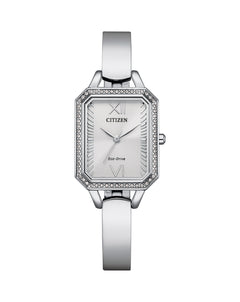 Read MoreThe stand out glittering appeal of this ladies watch will surely garner many a compliment. The delicate profile is accentuated by the sun-ray silver dial and the striking stainless steel bracelet and bezel. With its endless sparkle, this watch is boldly feminine and an exquisite addition to your jewellery and watch collection. Featuring roman numeral markers at the 12 and 6, it will be a staple piece for any occasion. With functionality to match its style, this piece is equipped with Eco-Drive technology and water resistance to 50 meters, perfect for still water swimming.