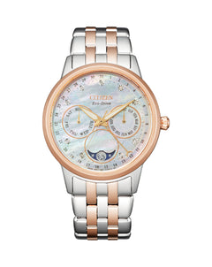 Read MoreA contemporary design with a romantic appeal, a highlight of this elegant and feminine watch is that it is the first moon phase model in Citizen’s ladies range. The moon phase complication allows you to track the moon’s current phase, letting you know when it is new, full, half or quarter moon. The moon phase indicator is showed through an aperture at 6 o’ clock, complemented by a charming crescent moon tip indicating the date. From the 36.5mm two tone case to the white mother of pearl dial adorned with 9 diamonds, this graceful watch is the epitome of understated elegance. The chic design also features Eco-Drive technology for unlimited power, 3 hands, day/date/month, mineral crystal glass and water resistance up to 50 meters, suitable for still water swimming. Calibre 8651.
