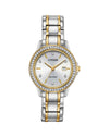 As part of Citizen Ladies Dress Collection, fashionable, precise and powered by light, creates an appeal unlike any other, decorated with crystals. Featured in two-tone stainless steel case and bracelet with a silver dial. Featuring our Eco-Drive technology – powered by light, any light. Never needs a battery. Caliber number J710.