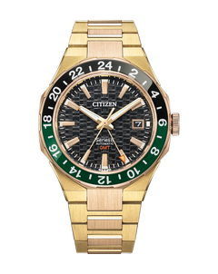 Read MoreDesigned for the modern explorer, the Citizen Series 8 880 GMT combines practicality, innovation, and sleek style. Its 41mm rose and gold-tone stainless steel case is paired with a striking black and green bi-directional bezel, showcasing Citizen's signature polished and brushed finishing. Powered by the advanced Caliber 9054 movement, this watch features dual time zone functionality with an independently adjustable hour hand, ideal for travelers. The automatic GMT mechanism is visible through a sapphire crystal exhibition case back and boasts a remarkable accuracy of +20/-10 seconds per day, a 50-hour power reserve, and a frequency of 28,800 v/h.The integrated two-tone H-link bracelet complements the case design with polished and brushed detailing, while the textured black dial offers standout readability with rose gold-tone luminous hands, applied indices, and an orange-tipped GMT hand. A date window at 3 o’clock adds utility, and the watch is water-resistant to 100 meters and resistant to magnetic fields up to 16,000 A/m. Blending sophistication with robust performance, the Series 8 880 GMT is ready for every journey, near or far.
