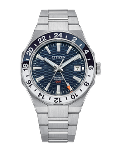 Read MoreThe Series 8 880 GMT is crafted for everyday wear and global adventures alike, blending functionality with contemporary style. The 41mm silver-tone stainless steel case is complemented by a blue and white bi-directional bezel, showcasing Citizen’s signature mix of brushed and polished finishes. Engineered for performance, it offers 100m water resistance and magnetic resistance up to 16,000 A/m. Powered by the high-performance Caliber 9054 automatic GMT movement, it features an independently adjustable hour hand for effortless time zone tracking, a 50-hour power reserve, and precision accuracy of +20 / -10 seconds per day. The integrated stainless steel H-link bracelet enhances comfort and style, while the sapphire crystal reveals a textured blue dial with luminous hands, applied indices, and a date display at 3 o’clock. A vivid orange GMT hand adds a sporty finishing touch.