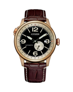 Read MoreAimed at sporting and in particular aviation enthusiasts but those that don’t want to compromise on style, this resourceful model is an automatic powered pilot design featuring large arabic numerals at the compass points and large indices for a clear, highly visible dial. Featuring the iconic small second counter at the 4 to 5 o’ clock position and inner rotating ring with minute counter. 2 hands and date indication. The brown calf band adds to the distinctive design yet with a classic flat mineral crystal glass, black dial and 42mm rose gold stainless steel case. Lending this timepiece a retro chic edge. Water resistance up to WR100/10 Bar suitable for swimming and snorkelling. Calibre 8213.