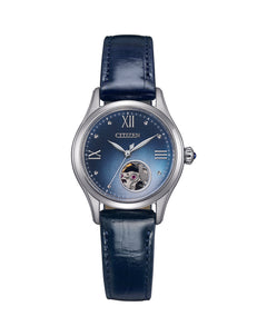 Read MoreA feminine design that combines the technology and craftsmanship Citizen has to offer. Part of the Women’s Automatic collection, this watch features a 40-hour power reserve, 50-meter water resistance, silver indices against a blue, open-heart dial encased in a stainless-steel case and matching blue leather strap. By incorporating functionality and design, you can experience luxury and confidence daily.